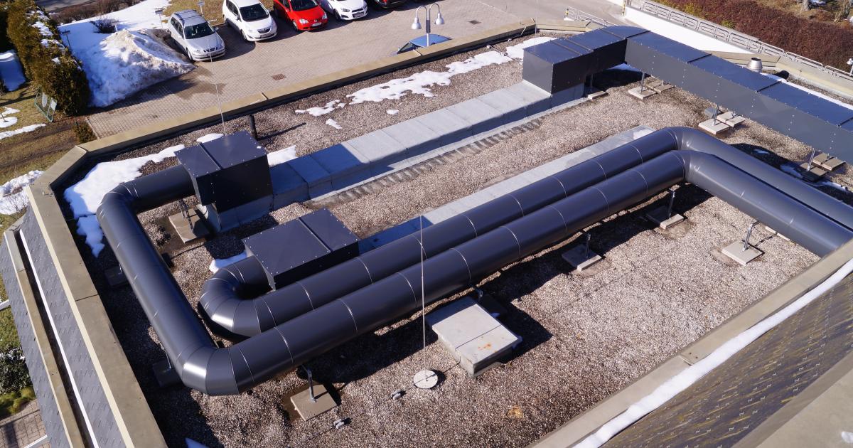 Luftleitungen wurden zum Teil im Freien am Flachdach verlegt und mit beschichteter Blechkanalisolierung ausgeführt (Sichtmontage).